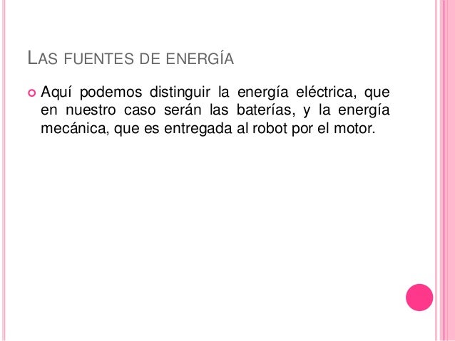 - 2. LAS FUENTES DE ENERGÍA Aquí podemos distinguir la energía eléctrica, queen nuestro caso serán las baterías, y la energíamecánica, que es entregada al robot por el motor.