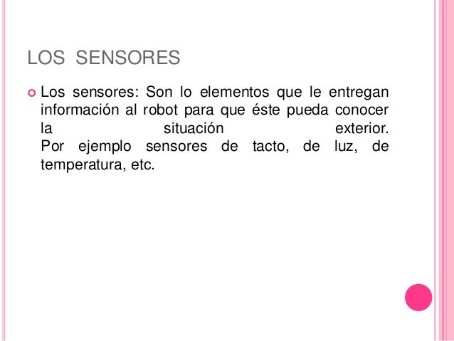 - 3. LOS SENSORES Los sensores: Son lo elementos que le entreganinformación al robot para que éste pueda conocerla situación exterior.Por ejemplo sensores de tacto, de luz, detemperatura, etc.