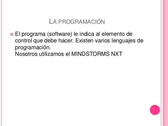 - 4. LA PROGRAMACIÓN El programa (software) le indica al elemento decontrol que debe hacer. Existen varios lenguajes deprogramación.Nosotros utilizamos el MINDSTORMS NXT