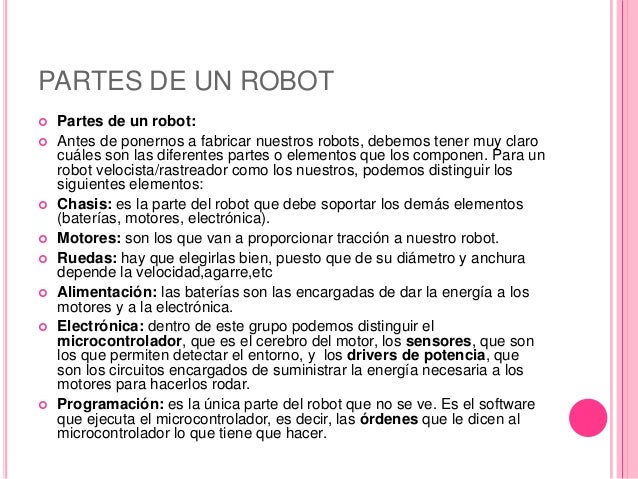 - 5. PARTES DE UN ROBOT Partes de un robot: Antes de ponernos a fabricar nuestros robots, debemos tener muy clarocuáles son las diferentes partes o elementos que los componen. Para unrobot velocista/rastreador como los nuestros, podemos distinguir lossiguientes elementos: Chasis: es la parte del robot que debe soportar los demás elementos(baterías, motores, electrónica). Motores: son los que van a proporcionar tracción a nuestro robot. Ruedas: hay que elegirlas bien, puesto que de su diámetro y anchuradepende la velocidad,agarre,etc Alimentación: las baterías son las encargadas de dar la energía a losmotores y a la electrónica. Electrónica: dentro de este grupo podemos distinguir elmicrocontrolador, que es el cerebro del motor, los sensores, que sonlos que permiten detectar el entorno, y los drivers de potencia, queson los circuitos encargados de suministrar la energía necesaria a losmotores para hacerlos rodar. Programación: es la única parte del robot que no se ve. Es el softwareque ejecuta el microcontrolador, es decir, las órdenes que le dicen almicrocontrolador lo que tiene que hacer.